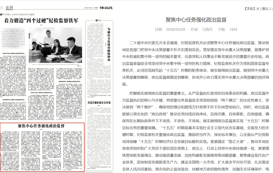 二十届中央纪委五次全会强调,纪检监察机关必须聚焦中心任务强化政治监督,推动各地区各部门把党中央决策部署不折不扣落到实处。贯彻落实党中央重大决策部署,是维护党中央权威和集中统一领导的根本要求,也是党和人民事业不断发展进步的重要历史经验。政治监督是督促全党坚持党中央集中统一领导的有力措施,纪检监察机关作为党和国家监督专责机关,必须自觉肩负起“十五五”时期的职责使命,做实做细政治监督,做到党中央重大决策部署到哪里,政治监督就跟进到哪里,形成齐心协力落实党中央重大决策部署的良好局面。
